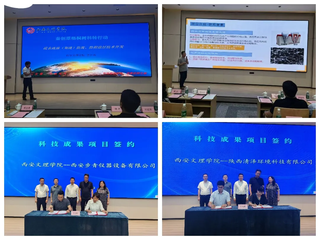 一行人首先参观了幸福林带规划展示中心,详细了解幸福林带科创聚集区规划建设情况,随后来到新城区“秦创原梧桐树”成果转化区进行实地考察。活动现场,新城区领导作致辞,诚邀高校科研团队和优质科技企业落地新城。西安文理学院李江涛教授和郭峰教授分别介绍了疏水疏油(双疏)防腐涂层的制备及应用和医用种植体表面的超声波酸蚀工艺及设备的最新成果。西安文理学院分别与西安步青仪器设备有限公司、陕西清泽环境科技有限公司进行成果签约。秦创原发展股份有限公司产业协同创新中心总监尹剑卿介绍高校概念验证中心建设与概念验证服务模式。