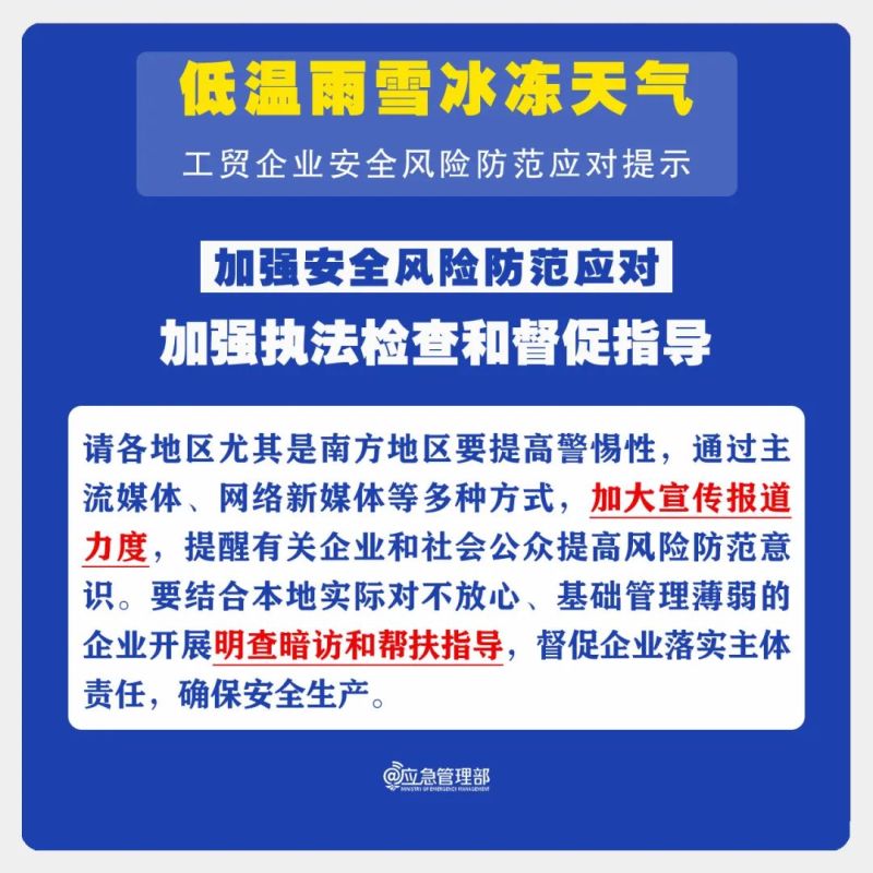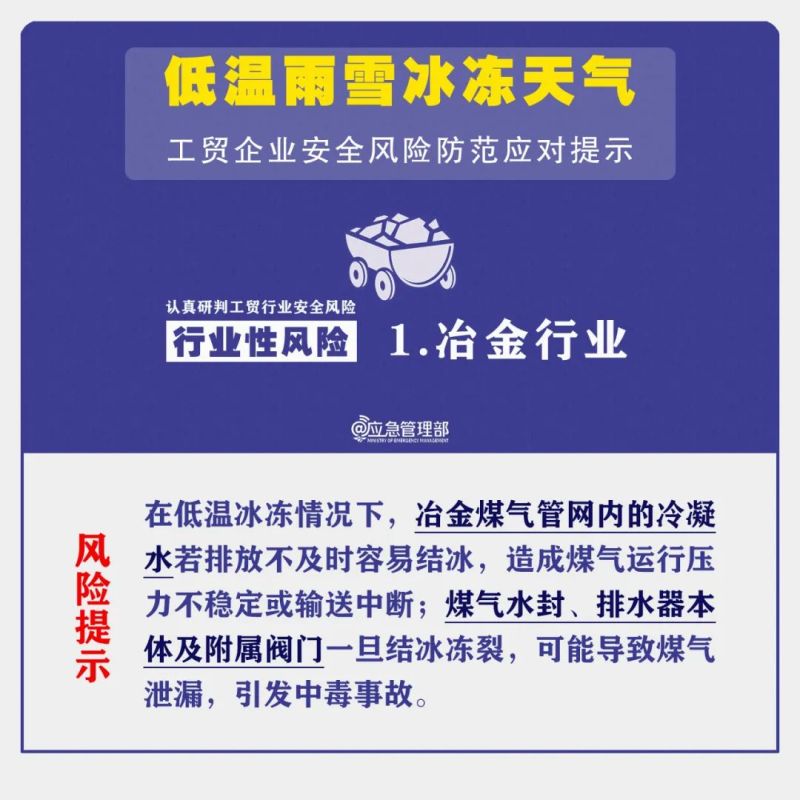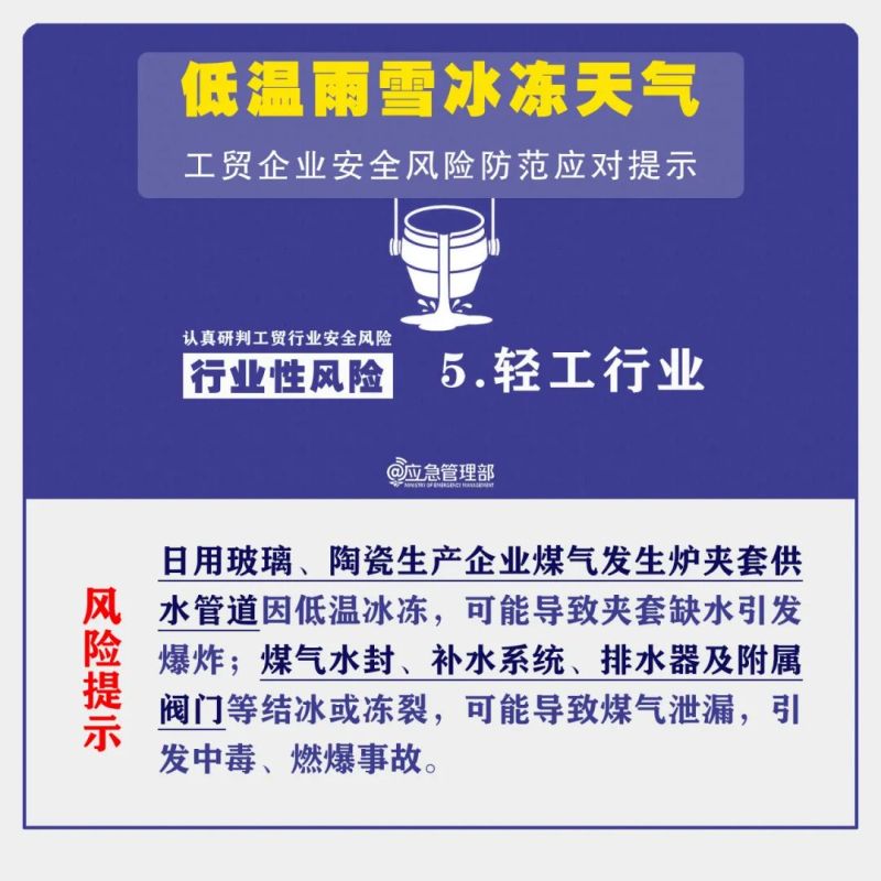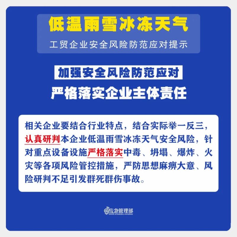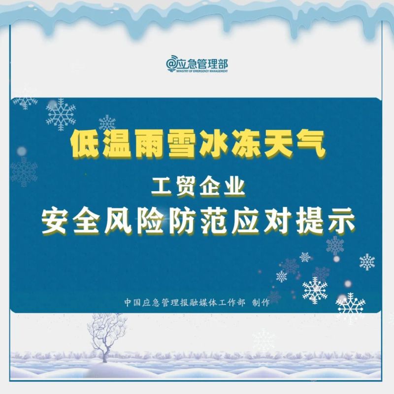 低温雨雪冰冻天气,持续时间长、影响范围广,防范不当极易引发事故。为进一步做好工贸企业安全风险防范应对,提示如下: