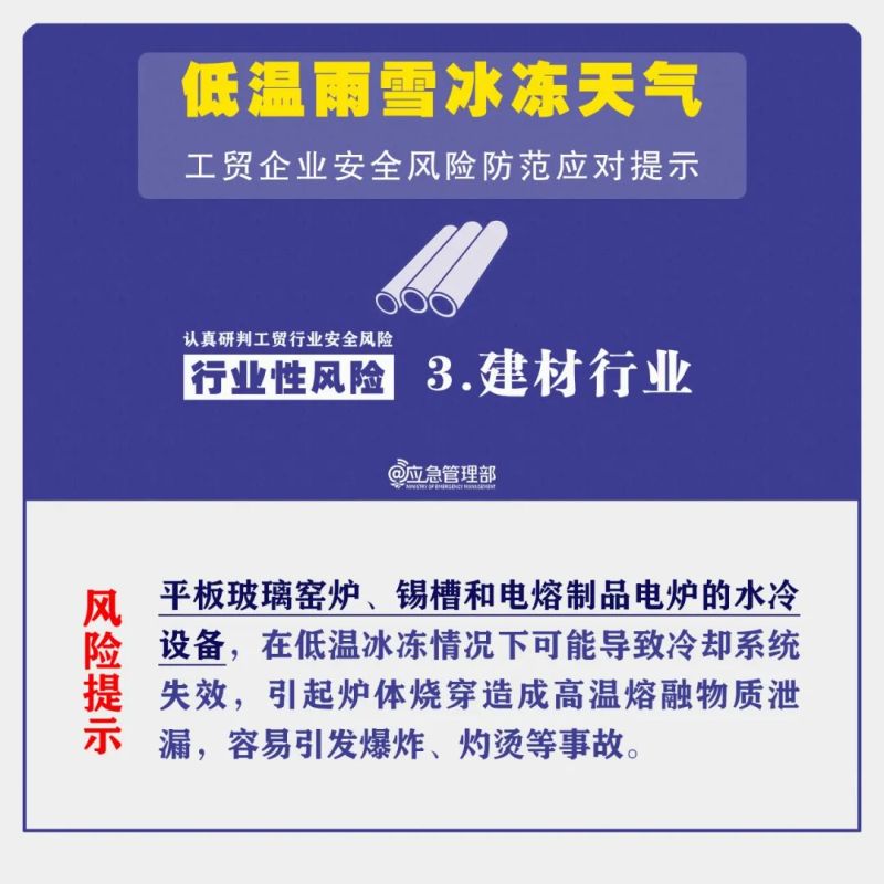 3.建材行业。平板玻璃窑炉、锡槽和电熔制品电炉的水冷设备,在低温冰冻情况下可能导致冷却系统失效,引起炉体烧穿造成高温熔融物质泄漏,容易引发爆炸、灼烫等事故。
