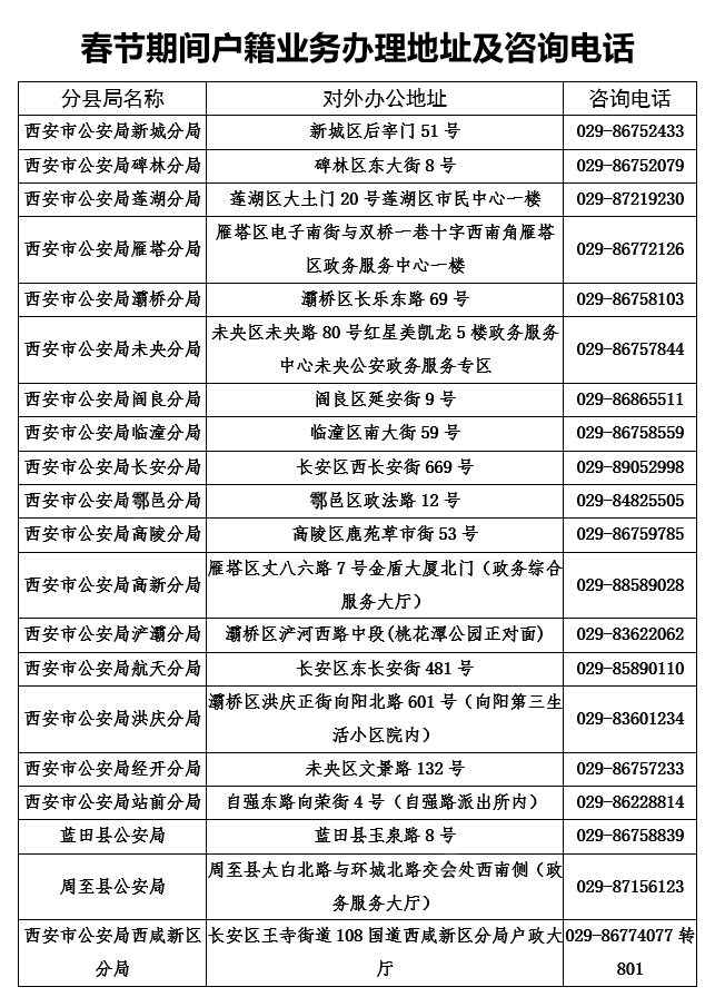 2月5日,西安市公安局发布提示,为了方便市民在春节期间办理户籍业务,全市20个公安分、县局开设“服务不打烊,春节我在岗”便民服务窗口。