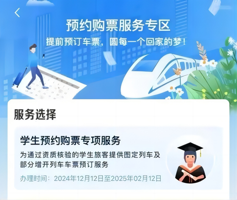 铁路部门坚持以人民为中心的发展思想,落实便民利民惠民措施,在总结2024年春运学生预约购票工作经验的基础上,科学分析出行规律,优化铁路12306系统功能,2025年春运期间继续推出学生预约购票专区服务。2024年12月12日至2025年2月12日,符合条件的学生旅客(家庭居住地与学校所在地不在同一城市,已通过学生优惠资质核验且有剩余优惠次数),可在铁路12306手机客户端“学生预约购票专项服务”专区,预约购买2024年12月28日至2025年2月28日的火车票,同一账户最多可同时提交3个订单,每个订单可添加1个乘车日期的5个“车次+席别”的组合,可选席别为学生优惠票适用的硬座、硬卧、二等座,最多可为包含本人在内的9名学生旅客预约。