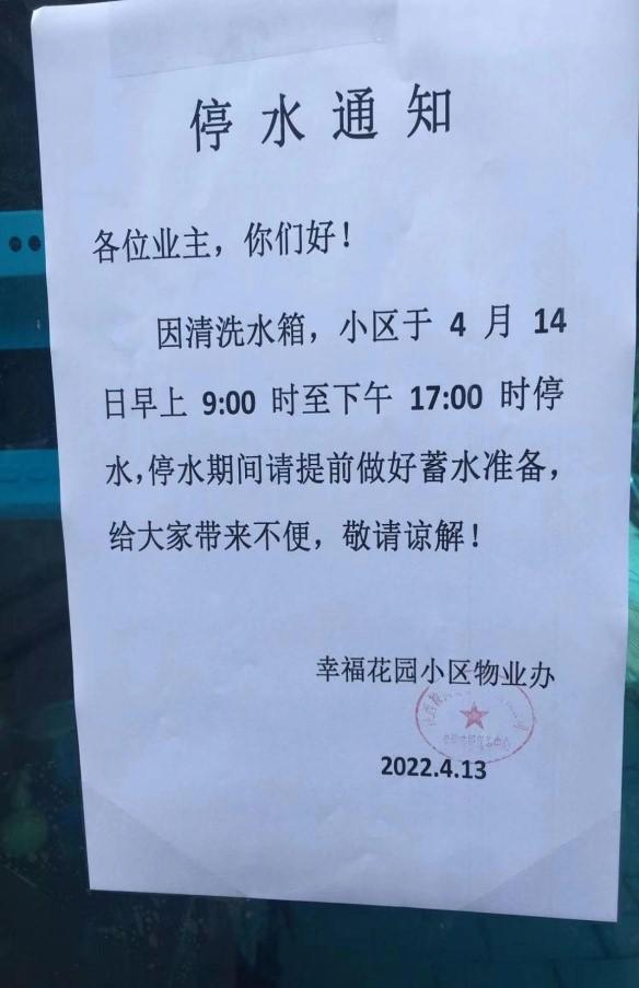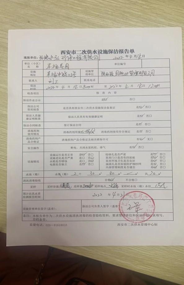 幸福花园小区物业已于4月14日对水箱进行清洗,水质符合用水标准(后附清洗水箱的记录)。另外,小区内有售卖纯净水的水箱,居民也可根据实际情况,自由购买。