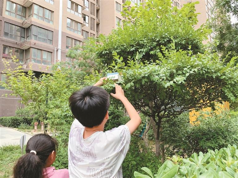 孩子们将做好的鸟屋放到树上。 (记者 雷杰 摄)
