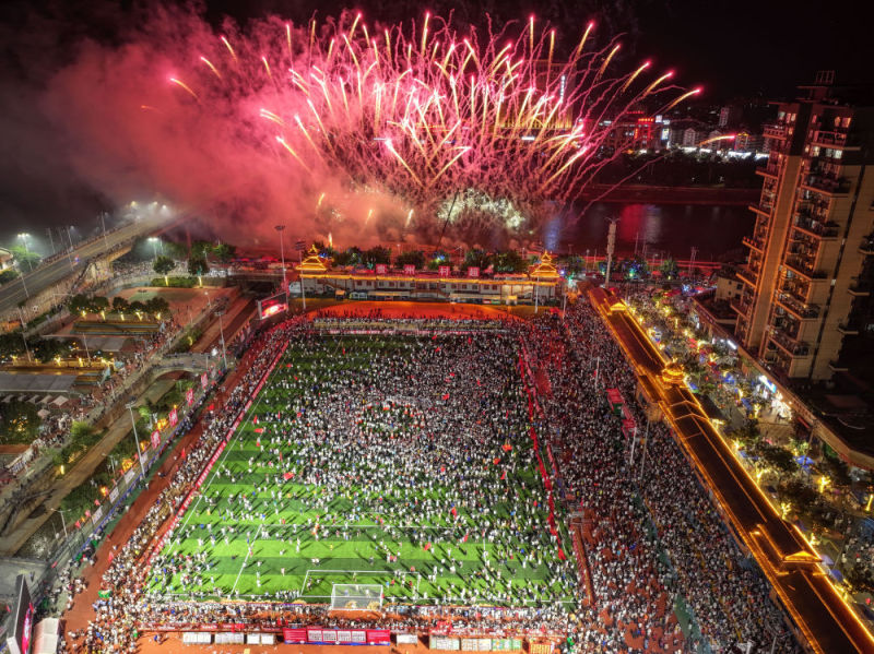 7月26日,贵州“村超”球场拍摄的烟花秀(无人机照片)。当日,贵州榕江举行主题为“感恩重启·贵州超力量”的超级星期六活动,球星巴乔、卡洛斯现场助阵,助力“村超”重燃赛事,正式回归。新华社记者 杨文斌 摄