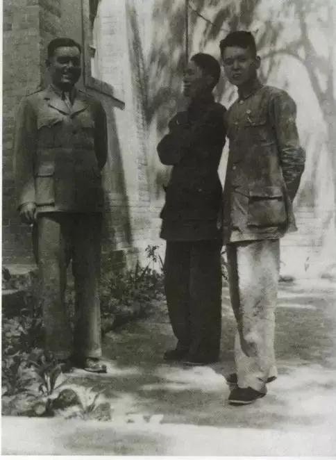 驻陕办事处处长周子健(左三)、总务科长莫钧涛(左二)与巴苏华(左一)在一号院的合影。