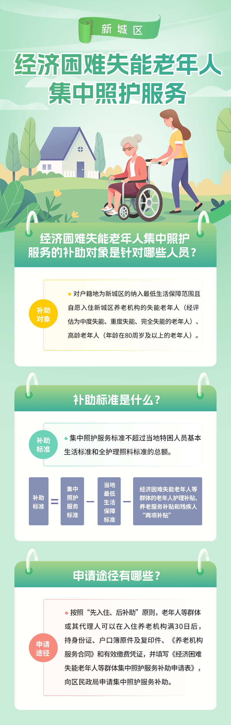 【图片解读】经济困难失能老年人集中照护服务的补助对象是针对哪些人员?补助标准是什么?申请途径有哪些?