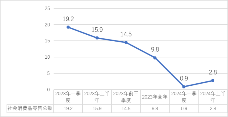 2023年至今社会消费品零售总额各季度增长情况(单位:%)