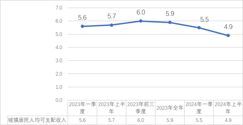 2023年至今城镇居民人均可支配收入各季度增长情况(单位:%)