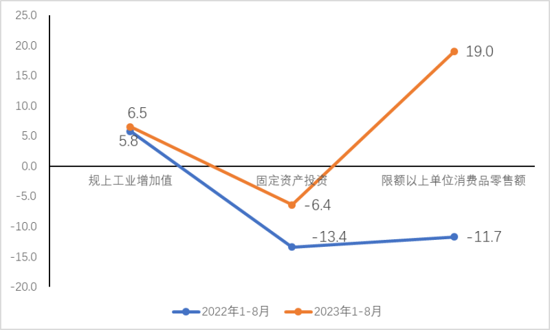 2023年1-8月区属规模以上工业增加值同比增长6.5%,较上年同期提高0.7个百分点;固定资产投资同比下降6.4%,较上年同期提高7.0个百分点,限额以上单位消费品零售额同比增长19.0%,较上年同期提高30.7个百分点。
