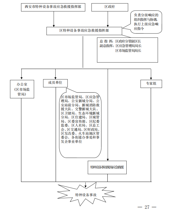 成员单位:区市场监管局、区应急管理局、公安新城分局、公安站前分局、新城消防救援大队、交警新城大队、区卫健局、生态环境新城分局、区住建局、区城管局、区委宣传部、区纪委监委、区人社局、区总工会、区交通局、区财政局、区发改委、西安火车站地区管委会、各街道办事处和事发企事业单位组成。(新城区特种设备事故应急指挥体系见附件2)