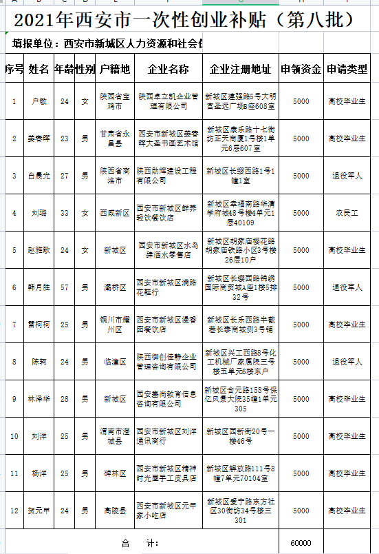 兹有下列人员,经核查满足申领一次性创业补贴相关条件,现依政策要求进行公示。
