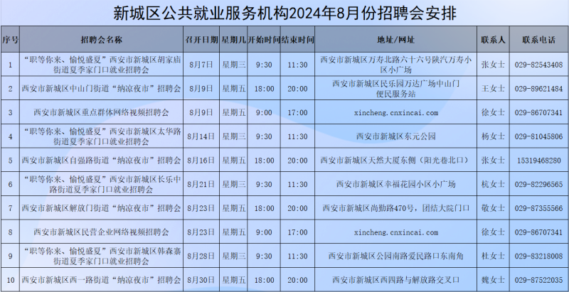 西安市新城区人力资源市场结合招聘需求,计划在8月份安排10场招聘会,其中2场网络招聘会,8场线下招聘会,积极服务于未就业毕业生、农民工、城镇失业人员、脱贫劳动力和有招聘需求的各类用人单位。免费为各类求职人员提供求职登记、职业指导等多项就业服务,为各类用工单位提供招聘登记、招聘信息发布、线上线下招聘洽谈等公共就业服务。