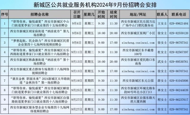 西安市新城区人力资源市场结合招聘需求,计划在9月份安排10场招聘会,其中3场网络招聘会,7场线下招聘会,积极服务于未就业毕业生、农民工、城镇失业人员、脱贫劳动力和有招聘需求的各类用人单位。免费为各类求职人员提供求职登记、职业指导等多项就业服务,为各类用工单位提供招聘登记、招聘信息发布、线上线下招聘洽谈等公共就业服务。