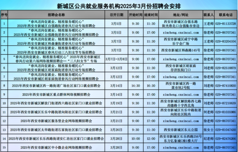 新城区人力资源市场结合招聘需求,计划在3月份安排15场招聘会,其中6场网络招聘会,9场线下招聘会,积极服务于未就业毕业生、农民工、城镇失业人员、脱贫劳动力和有招聘需求的各类用人单位。免费为各类求职人员提供求职登记、职业指导等多项就业服务,为各类用工单位提供招聘登记、招聘信息发布、线上线下招聘洽谈等公共就业服务。