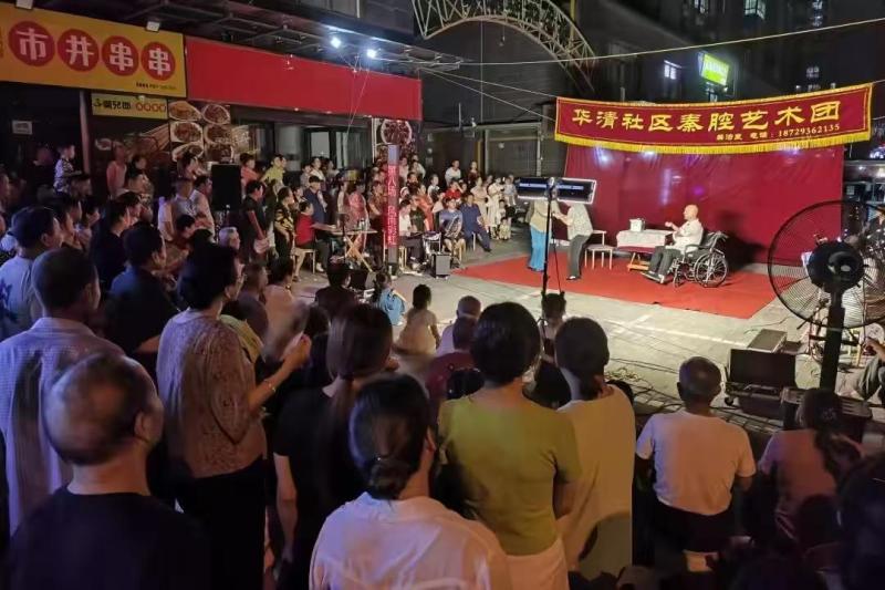 一声悦耳动听的秦声秦韵,从华清佳苑三期小区外美食街飘出,吸引了四邻八舍的群众前来观看,现场不时爆发出阵阵喝彩声,让大家在炎炎夏日里沉浸在文化氤氲的热闹氛围中。华清社区通过聚集陕西省戏曲研究院退休职工、秦腔戏迷协会会员、热爱秦腔艺术的爱好者等40余人,组建了华清社区秦腔艺术团,定期开展文化类志愿活动。从今年6月开始,每月都有表演计划,志愿者们精神抖擞、热情满怀地为辖区居民带来两个半小时的表演,将台下的居民深深吸引,他们时而屏气凝神,专注欣赏;时而掌声雷动,喝彩连连。不少居民还跟着熟悉的旋律轻声哼唱,脸上洋溢着幸福和满足的笑容。直到表演结束,有些群众仍迟迟不愿离去,连连叫好。